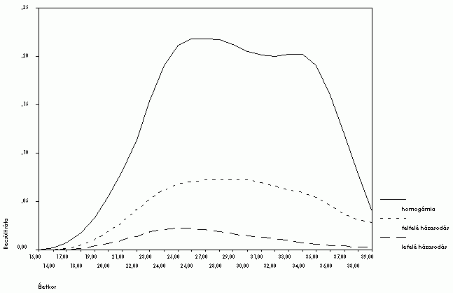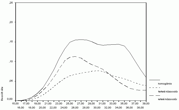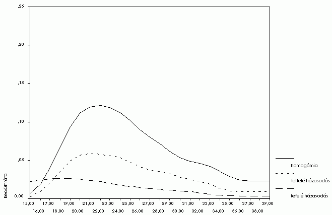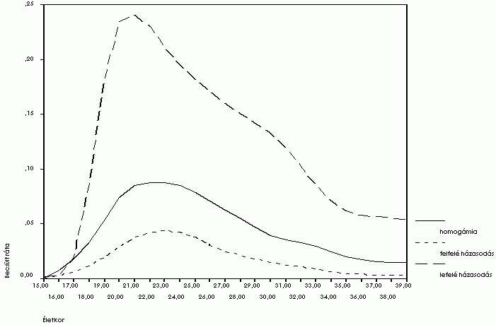 A hajadonok a sajátjuknál rosszabb iskolai végzettségû partnerhez fiatalon 20-21 éves korban mennek hozzá a leginkább, aztán meredeken visszaesik a lefelé házasodás valószínûsége. Az azonos iskolai csoporton belül való házasodásra 22-23 éves korban van a legnagyobb esély; iskolázottabb partnert pedig 24-25 évesen választanak a leggyakrabban a nõk. A férfiaknál nincsenek ilyen mértékû idõzítési differenciák.