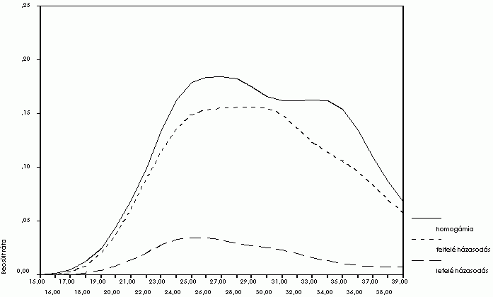 Ugyanez a logika érvényesülhet az intergenerációs szempontból lefelé mobil nõknél is. Vagyis amikor a "jó háttérrel" rendelkezõk keresnek maguknak házastársat, akkor saját "származási" ismeretségi, baráti körükben néznek szét, és onnan választanak maguknak társat függetlenül attól, hogy iskolai végzettségük az apjukénál alacsonyabb. Ez esetben még egy figyelemre méltó eredmény, hogy éppen az apjukénál alacsonyabb iskolázottságú nõk között mutatkozott legalacsonyabbnak a házasságkötési valószínûség. Ez feltehetõen azzal magyarázható, hogy ezek a nõk olyan családi környezetben nõttek fel, amely egyrészt megfelelõ partner hiányában "nem írja elõ" a házasságkötést; másrészt képes olyan mennyiségû anyagi erõforrás elõteremtésére, amely nem teszi szükségessé a párkapcsolat-teremtést.